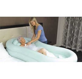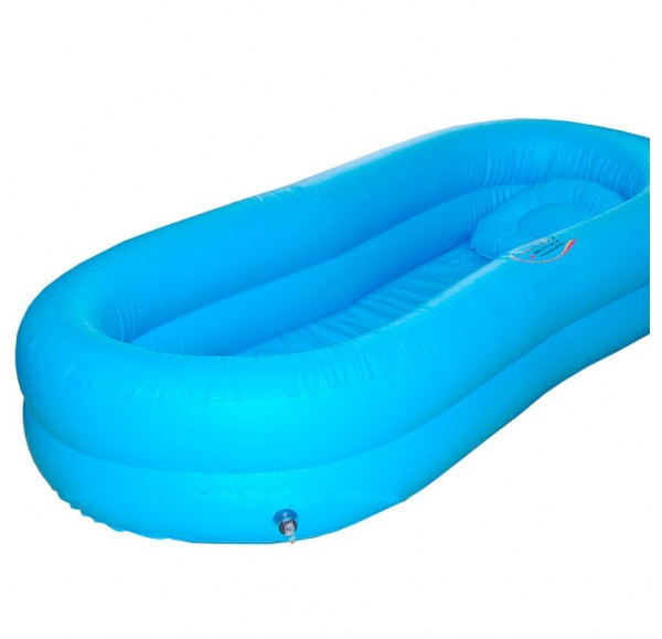 Ванна надувная используется для приема водных процедур больными с ограниченной подвижностью или постельным режимом. В сдутом состоянии ванна стелется на кровать под человеком и надувается с помощью электронасоса, поставляющегося в комплекте вместе с ванной. После использования ванну также легко сдуть с помощью электронасоса. В комплект с ванной входят: электронасос, сливной шланг, шланг с душевой насадкой, ремонтный набор, надувная подушка. Электронасос поставляется с тремя насадками для надувания, а также инструкцией по эксплуатации. Для откачки воздуха используется второе гнездо сверху насоса. Сливной шланг подсоединяется ко дну ванны, что позволяет сливать воду сразу после водных процедур. Шланг с душевой насадкой благодаря своей длине просто подсоединить к источнику воды. Насадка отсоединяется. Ремонтный набор позволяющий заклеить мелкие повреждения ванны. В его комплект входят виниловые заплатки и клеящее средство. Надувная подушка позволяет зафиксировать голову и шею в удобном положении. Надувается отдельно от ванны.